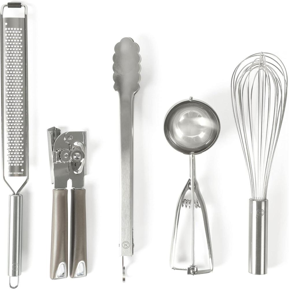 From the countertop to the stove, handy kitchen gadgets will keep up with the quick and busy transition from food prep to cooking. The Richburn 5-piece Stainless Steel Gadget Set from Martha Stewart stay true to their function while adding a touch of elegance to any kitchen. Crafted from high-quality stainless steel for long-lasting strength and impeccable luster, this collection of gadgets promotes ease of use and everyday convenience. Sturdy handles provide a comfortable and confident grip. Each stainless steel gadget is designed for a specific function to help duriing food prep or any kitchen task – from beating eggs, mixing dressings and grating cheese to scooping cookie doughs, grabbing and serving meat, or opening cans. Hand wash only.