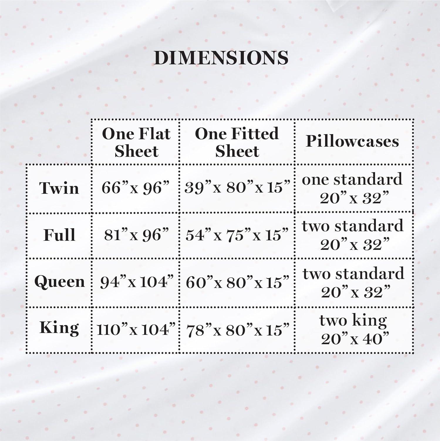 Queen Sheet Set Includes: 1 Flat Sheet (94in x 104in), 1 Fitted Sheet (60in x 80in x 15in), 2 Standard Pillowcases (20in x 32in)