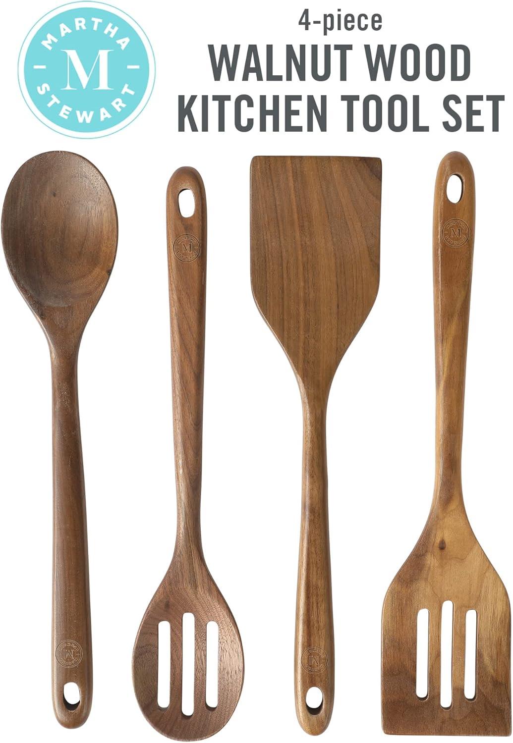 Martha Stewart Bainford 4-Piece Wooden Kitchen Utensil Set, Walnut – Cooking Spoons and Turner Tools for Nonstick Cookware, Heat Resistant, Durable Hardwood