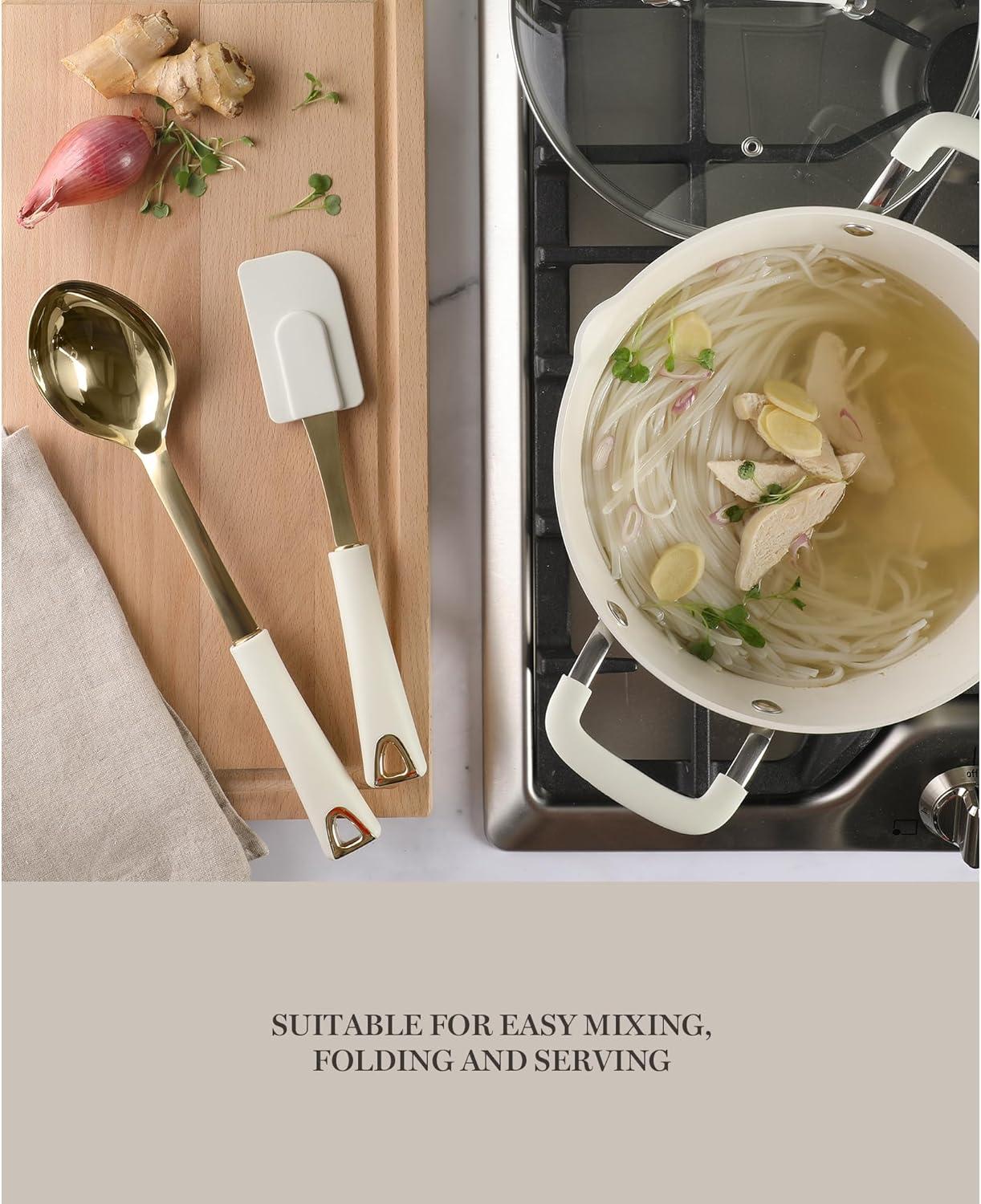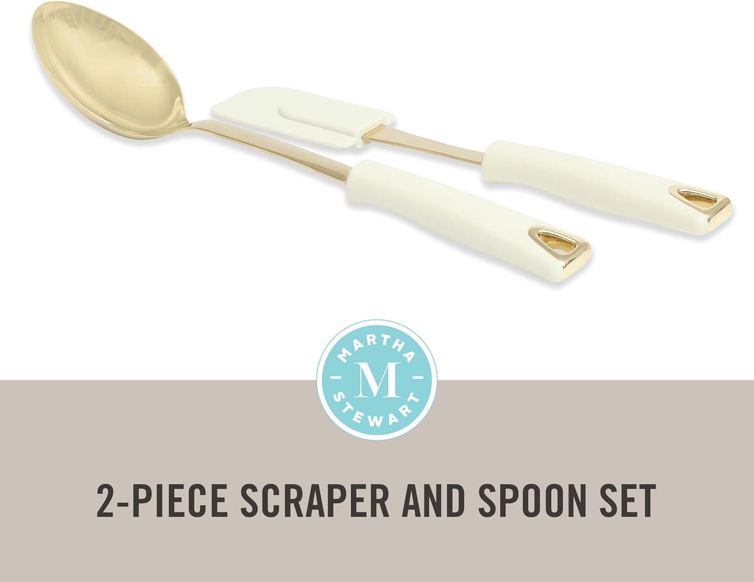 Martha Stewart Lockton 2-Piece Kitchen Scraper and Spoon Set – Stainless Steel and Nylon Cooking Utensils with Linen Handles and Gold Accents, Durable Heat-Resistant Tools