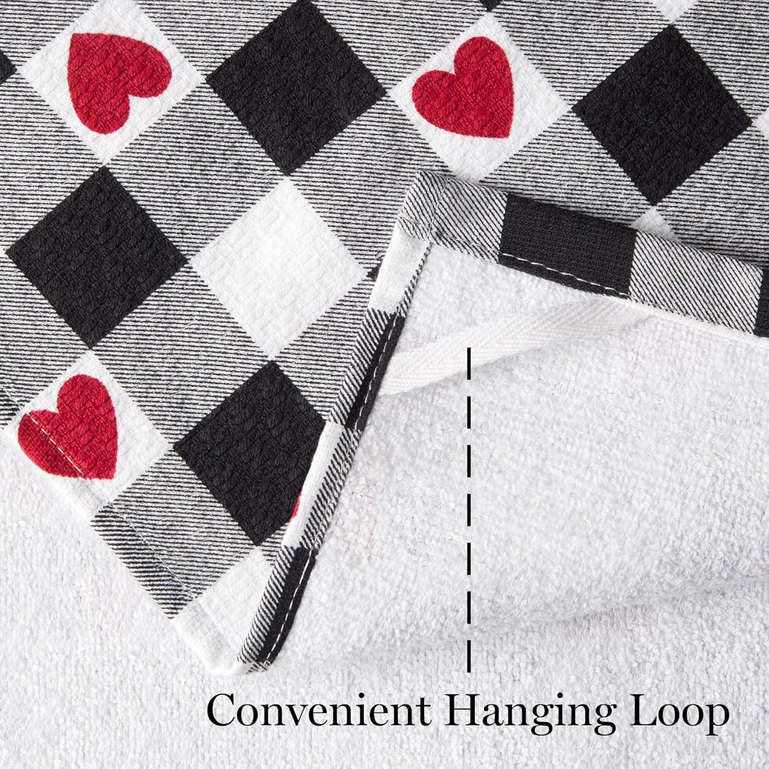 Martha Stewart Love Check Gingham Hearts Decorative Kitchen Towels 3-Pack Set, 100% Cotton, Absorbent, Valentine’s Day Décor, Black/White/Red, 16”x28”